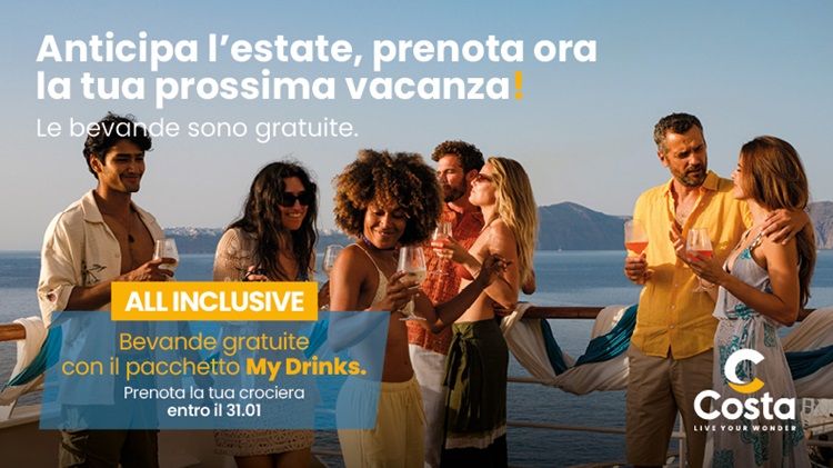 Costa Crociere dà il via al grande piano strategico di iniziative commerciali per il nuovo anno con una promozione che anticipa l’estate, prevedendo vantaggi esclusivi per i Partner e i Clienti. La nuova offerta è All Inclusive Bevande Gratis ed è valida per le prenotazioni effettuate entro il 31 gennaio 2025 su tutte le crociere in partenza da fine febbraio al 30 novembre 2025 alla scoperta del Mediterraneo Occidentale, Orientale e del Nord Europa. La tariffa All Inclusive consente di vivere un’esperienza di vacanza ancora più completa e senza pensieri, con tasse portuali e quote di servizio incluse. Inoltre, per tutti i giorni del viaggio e per ogni membro della prenotazione il pacchetto “My Drinks” è gratuito e prevede bevande illimitate, analcoliche, alcoliche e cocktail.