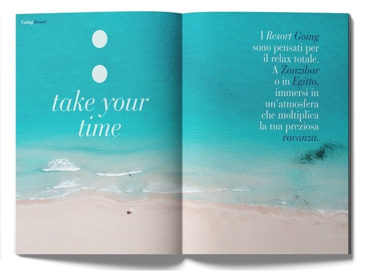 La brochure si apre con la G di “Guardare oltre con occhi che volgono all’infinito” e si lascia sfogliare nelle quattro linee di prodotto “Rapiti dal fascino che sta dentro un viaggio Going”: Going Resort: soggiorni all inclusive in strutture a cinque stelle; Going Tailor Made: viaggi su misura; Going Lifestyle: selezione di hotel di fascia alta e località balneari; Going4Cruise: esperienze pre e post crociera in collaborazione con MSC Cruises