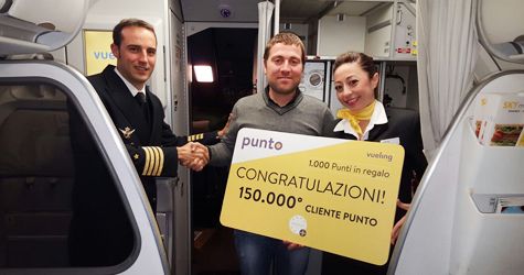 Vueling celebra un importante traguardo per il suo programma fedeltà ‘Punto’ premiando il passeggero numero 150.000 in Italia. Solo nel 2015, il numero di iscritti al programma fedeltà è aumentato del 76% rispetto all’anno scorso. Sono molti i viaggiatori italiani che hanno già scelto di iscriversi, gratuitamente, per approfittare del piano che consente di accumulare punti ogni volta che si vola con Vueling ed utilizzarli per acquistare il viaggio successivo. Il fortunato passeggero numero 150.000 è Salvatore Plances, che ha viaggiato sul volo VY6159 sulla rotta da Palermo a Roma-Fiumicino. La compagnia aerea ha festeggiato questo traguardo consegnando al passeggero un maxi biglietto di congratulazioni e regalandogli 1.000 punti ‘Punto’ in omaggio, equivalenti ad un viaggio di andata e ritorno verso una destinazione a sua scelta.
