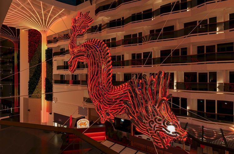 - NOVITÀ! Scultura del Drago: Una sorprendente scultura in acciaio inox raffigurante un drago, sospesa a 10 metri di altezza sopra la World Promenade, catturerà l’attenzione degli ospiti. Lunga 12 metri e larga 9, la scultura sarà adornata con quasi 700 specchi e 3.000 luci LED che si illumineranno la sera a bordo di MSC World Asia.