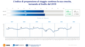 La voglia di vacanza vince su tutto: l’indice di propensione al viaggio torna allo stesso livello pre-pandemia a 67 punti (su scala da 0 a 100) e 23 milioni di italiani tra i 18 e i 74 sono intenzionati a partire nel periodo estivo, anche se in uno scenario caratterizzato da una certa “volatilità”. Infatti, di questi 23 milioni solo 4 su 10 hanno già prenotato un viaggio, mentre per i restanti rimane per ora solo l’intenzione che probabilmente si tradurrà in prenotazione tardiva, se non addirittura “last minute”. Da un lato, quindi, si assiste ad un vero e proprio nuovo stile di vacanza all’insegna della libertà di scelta e di cambiare idea, dall’altro, si avverte un segnale di forte cautela da parte della domanda, anche perché ben 6 italiani su 10 si dichiarano preoccupati per le conseguenze dell’inflazione e del caro energia. L’unica cosa certa è il danno per la programmazione dell’attività degli operatori: questi i principali risultati che emergono dall’Osservatorio Confturismo-Confcommercio nella rilevazione di fine aprile.